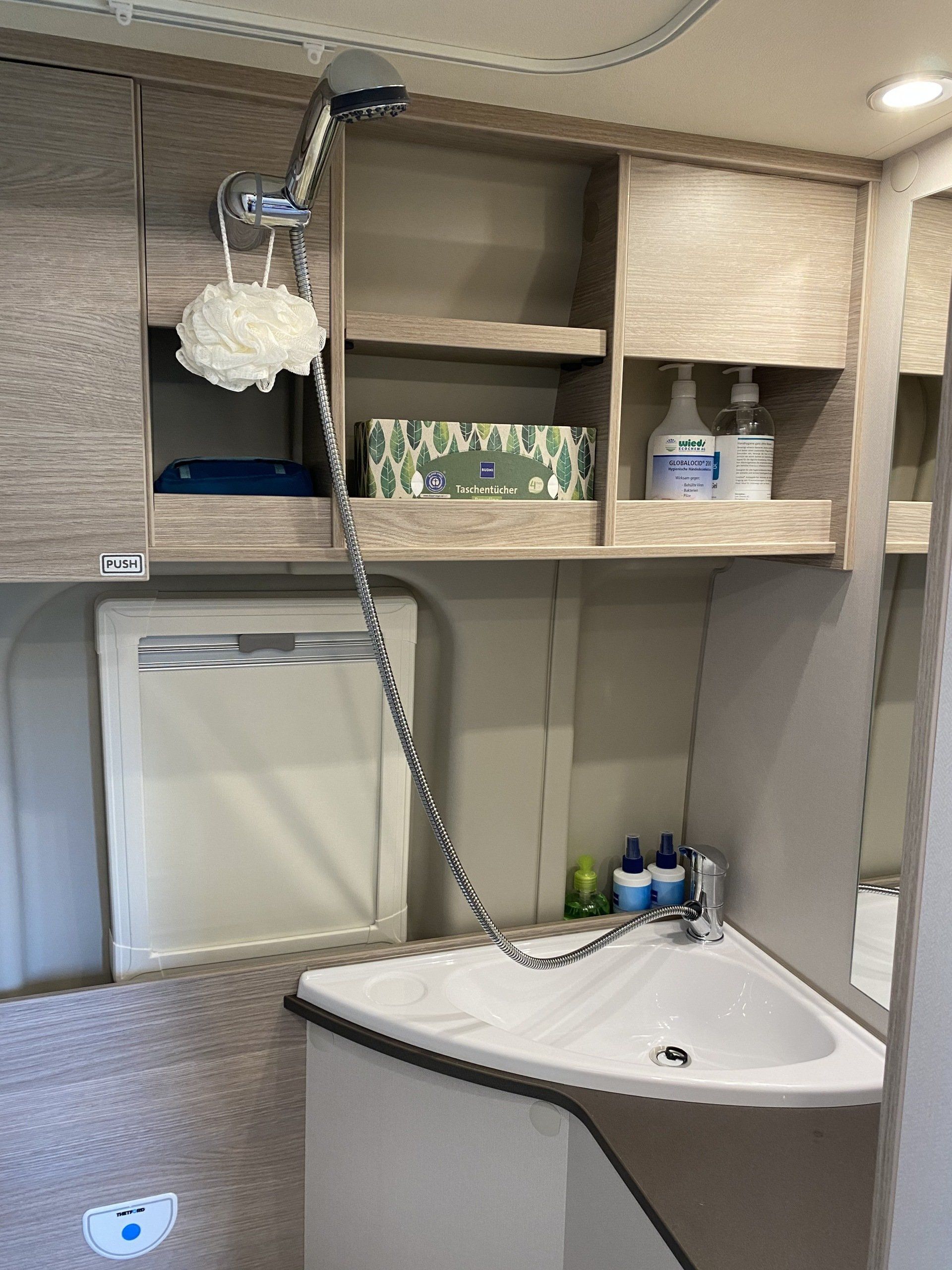 Auch Eurer Körperpflege könnt ihr in der integrierten Toilette und Dusche mit Spiegel ausreichend Zeit widmen und Euch für einen Ausflug in die Stadt „frisch“ machen.