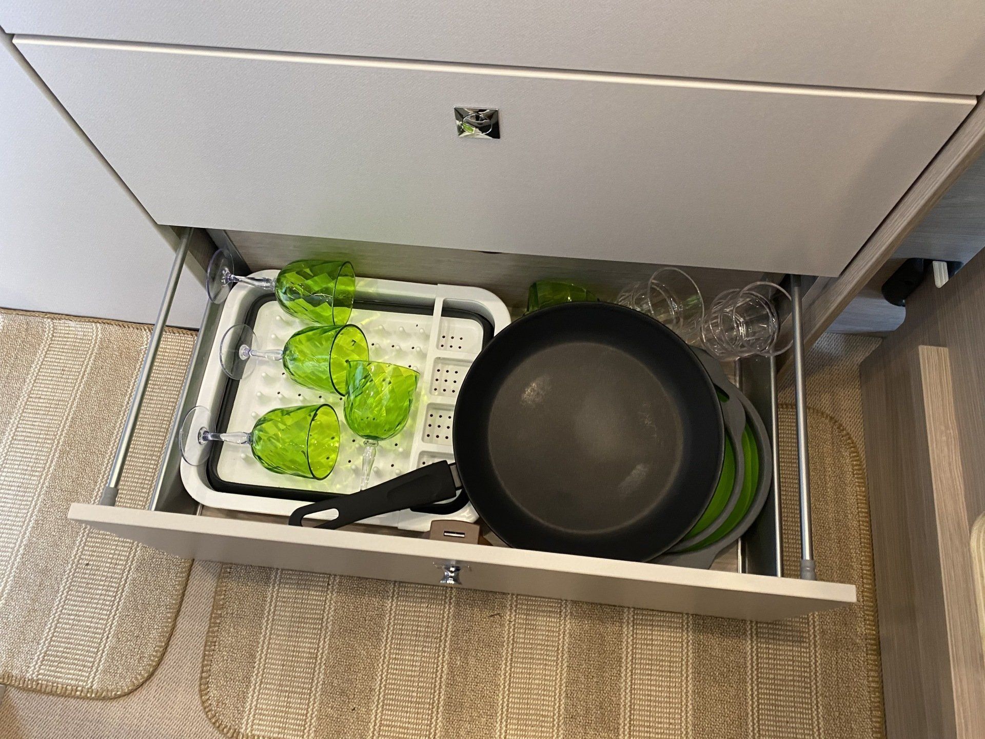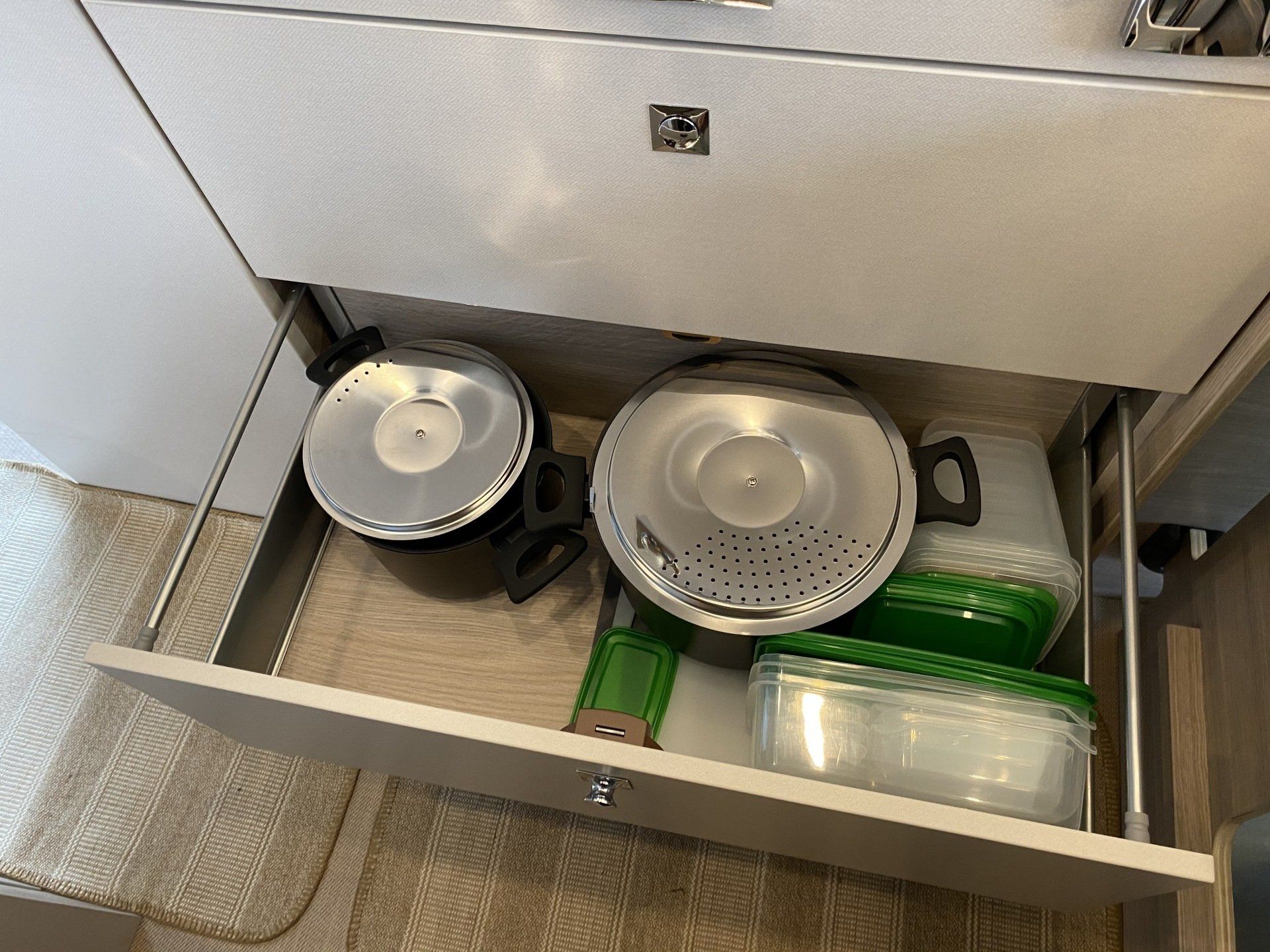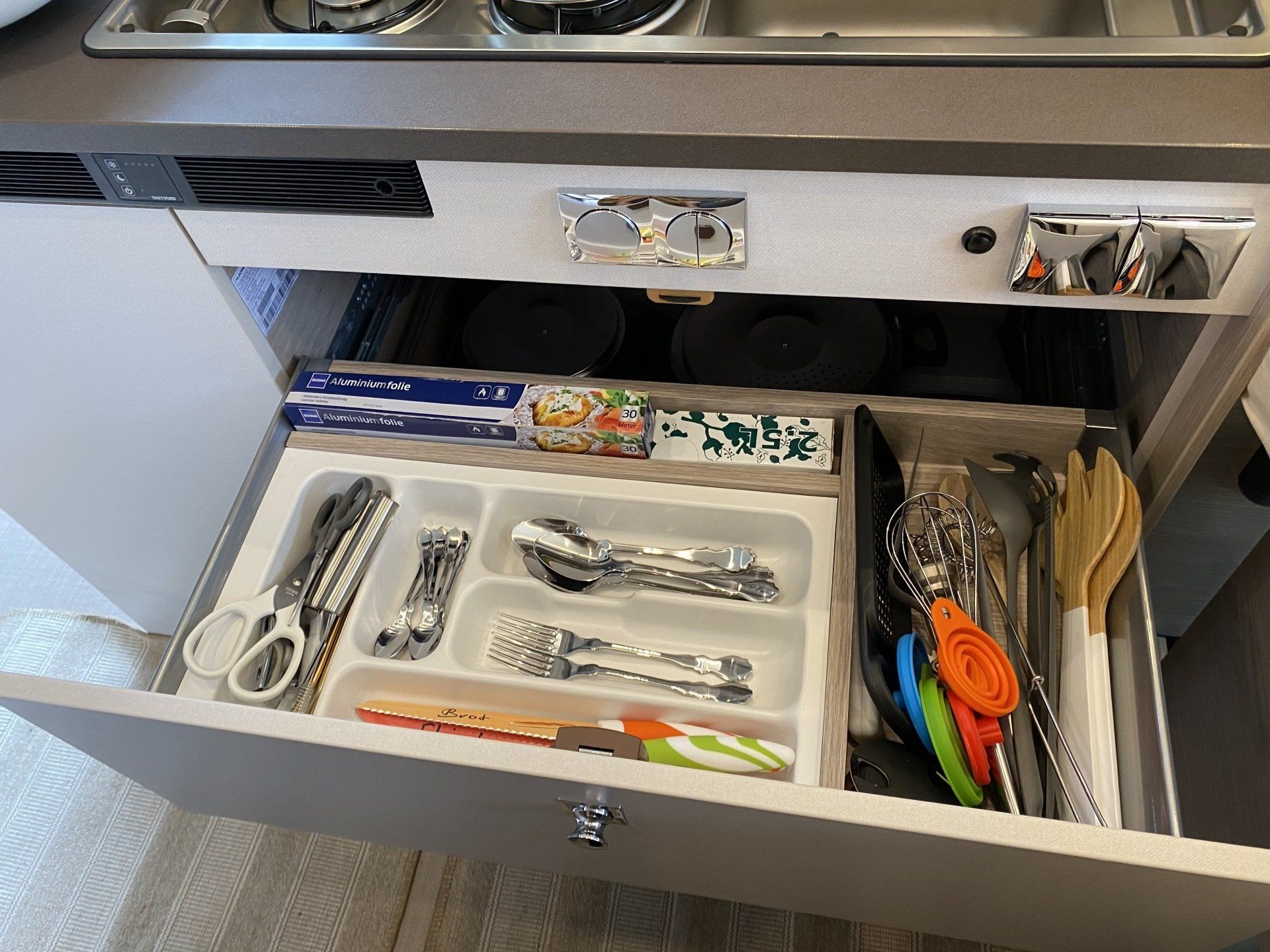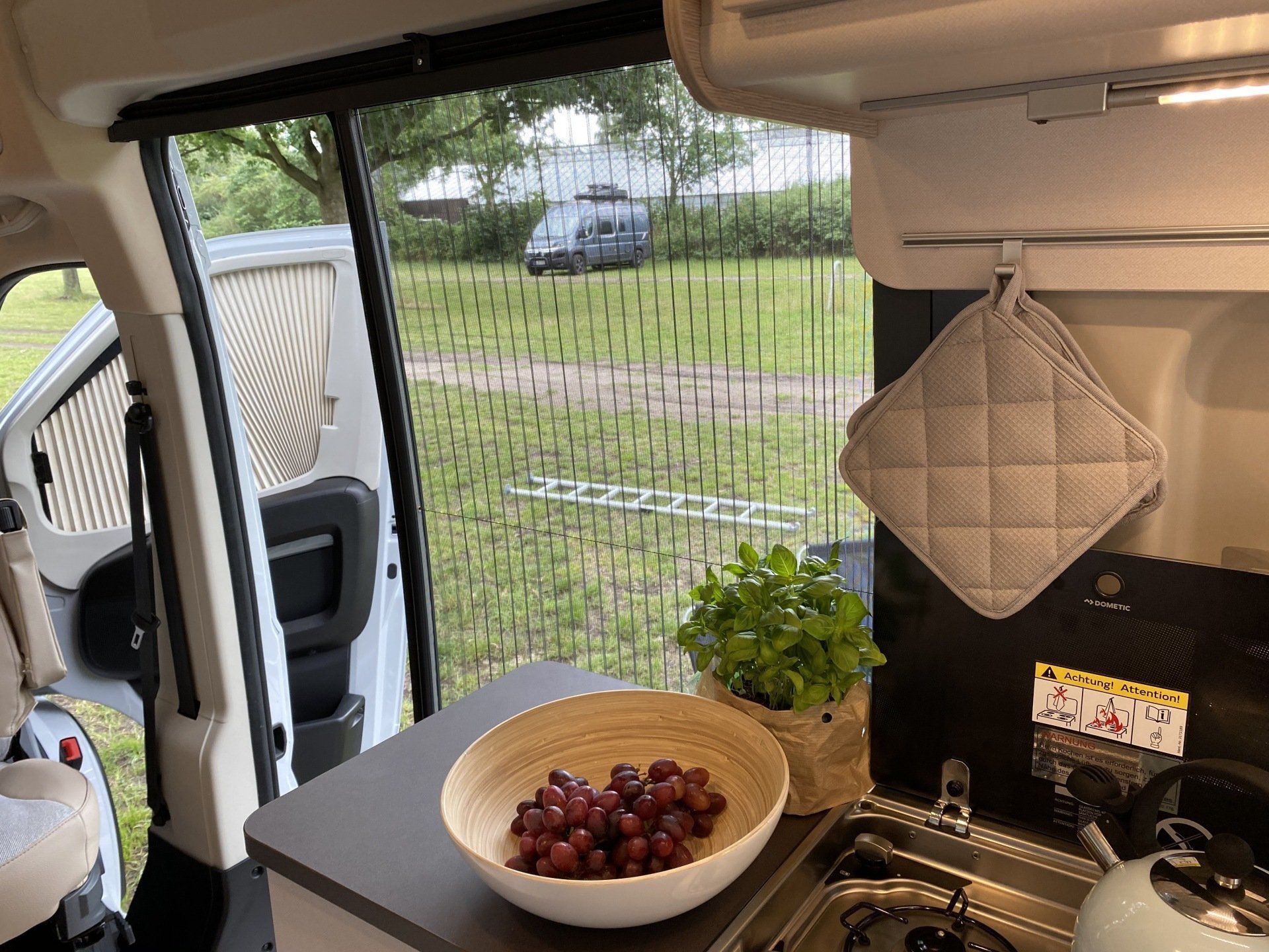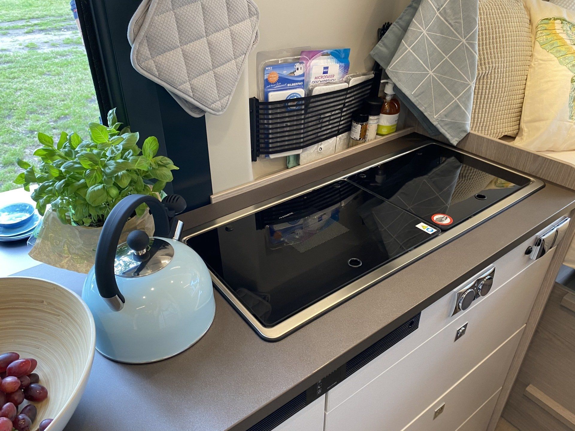 Mobi bietet Euch eine kleine aber feine Küche mit 2-Flammen-Gaskochfeld, eine Spüle, einen Kühlschrank mit Eisfach und ausreichend Küchenzubehör, wie z.B. Töpfe, Pfannen, Küchenhelfer und vieles mehr um Euren Kochkünsten freien Lauf zu lassen.