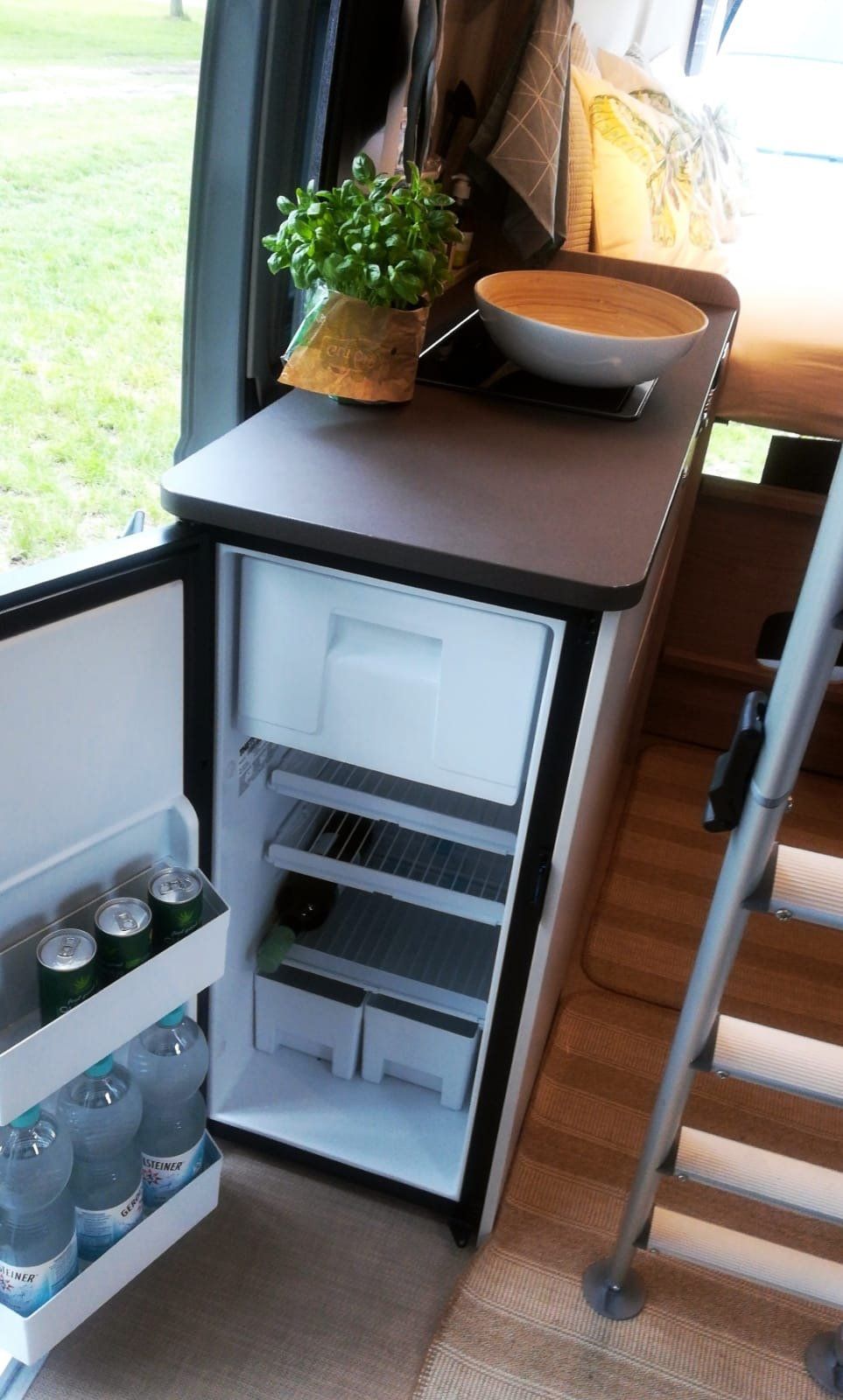 Mobi bietet Euch eine kleine aber feine Küche mit 2-Flammen-Gaskochfeld, eine Spüle, einen Kühlschrank mit Eisfach und ausreichend Küchenzubehör, wie z.B. Töpfe, Pfannen, Küchenhelfer und vieles mehr um Euren Kochkünsten freien Lauf zu lassen.