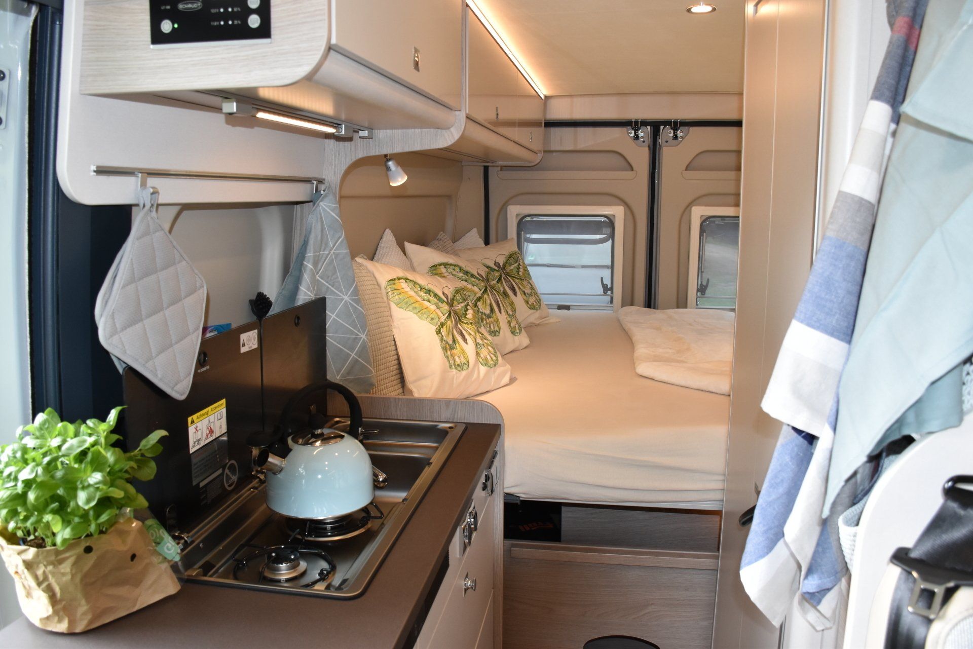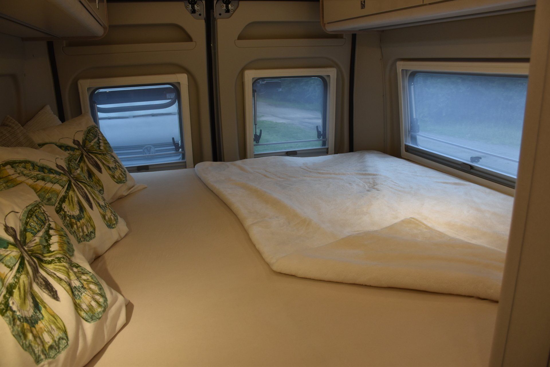 Er hat Platz für 4 Personen und verfügt über zwei Betten (1x Kingsize Heckbett und 1x Bett im Aufstelldach) indem je zwei Erwachsene sowie Kinder ausreichend Platz und Ruhe für einen erholsamen Schlaf finden.